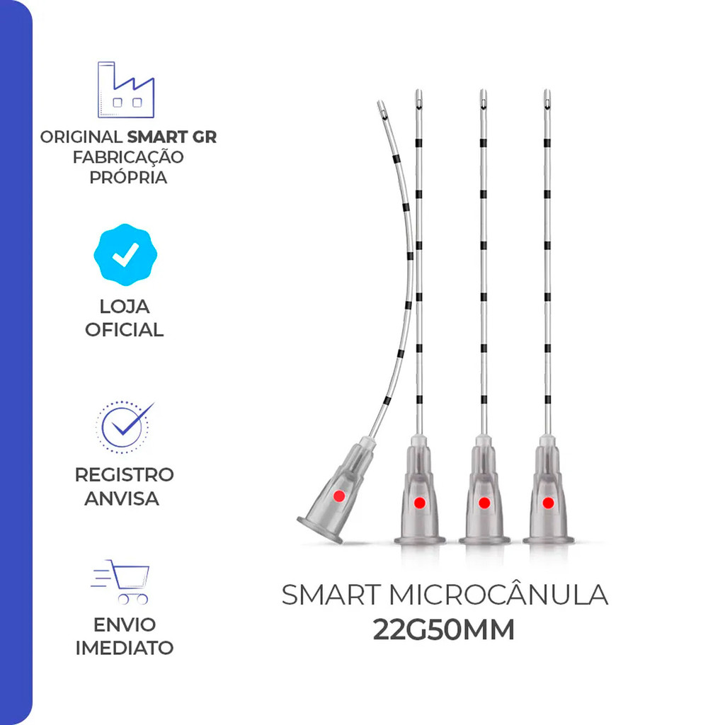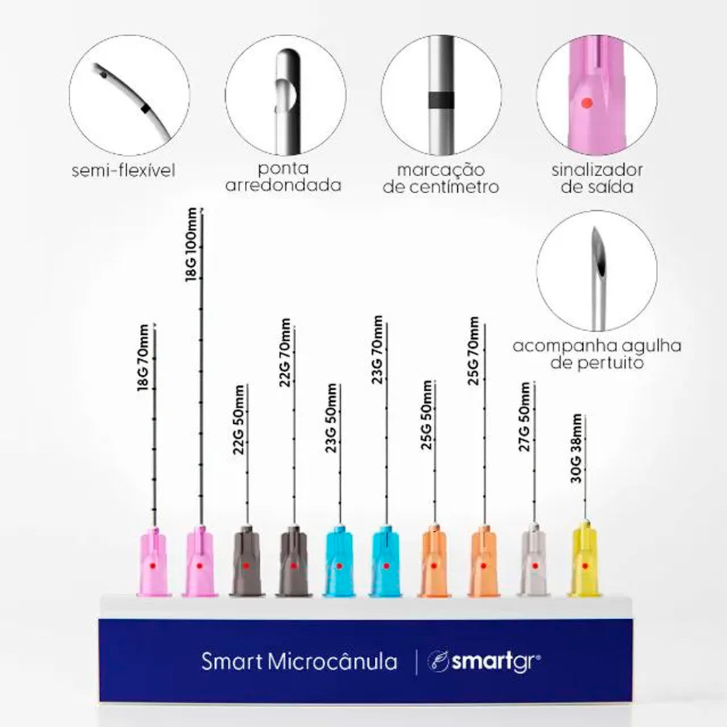 Dispositivo flexível e maleável para injeção intra ou subdérmica de ativos. A ponta arredondada das microcânulas Smart GR garante uma aplicação segura, possui em seu corpo marcação de centímetros para melhor controle e posicionamento. A Smart Microcânula acompanha agulha de pertuito, permitindo melhor performance e é ideal para seringas luer lock e slip.